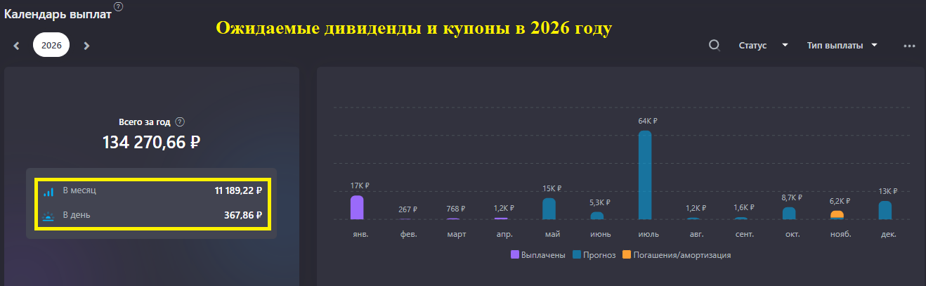 Ежемесячно я уже получаю 11 189 рублей (дивиденды + купоны). В текущем году ожидаю пассивный доход с фонды 134 270 рублей (из Сноубол).