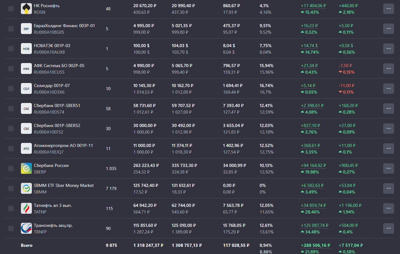 Объем портфеля 1 310 147 руб (согласно приложения брокера Сбер Инвестиции).