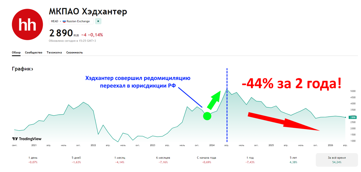 2 года подряд бумага плавно сползает вниз и за этот период котировки снизились на 44%. На графике явный нисходящий тренд. С одной стороны, разворота стоит ждать только при улучшении на рынке труда: снижение ставки ЦБ → активизация найма → рост спроса на услуги. С другой — текущая дешевизна акций выглядит как привлекательная точка входа.