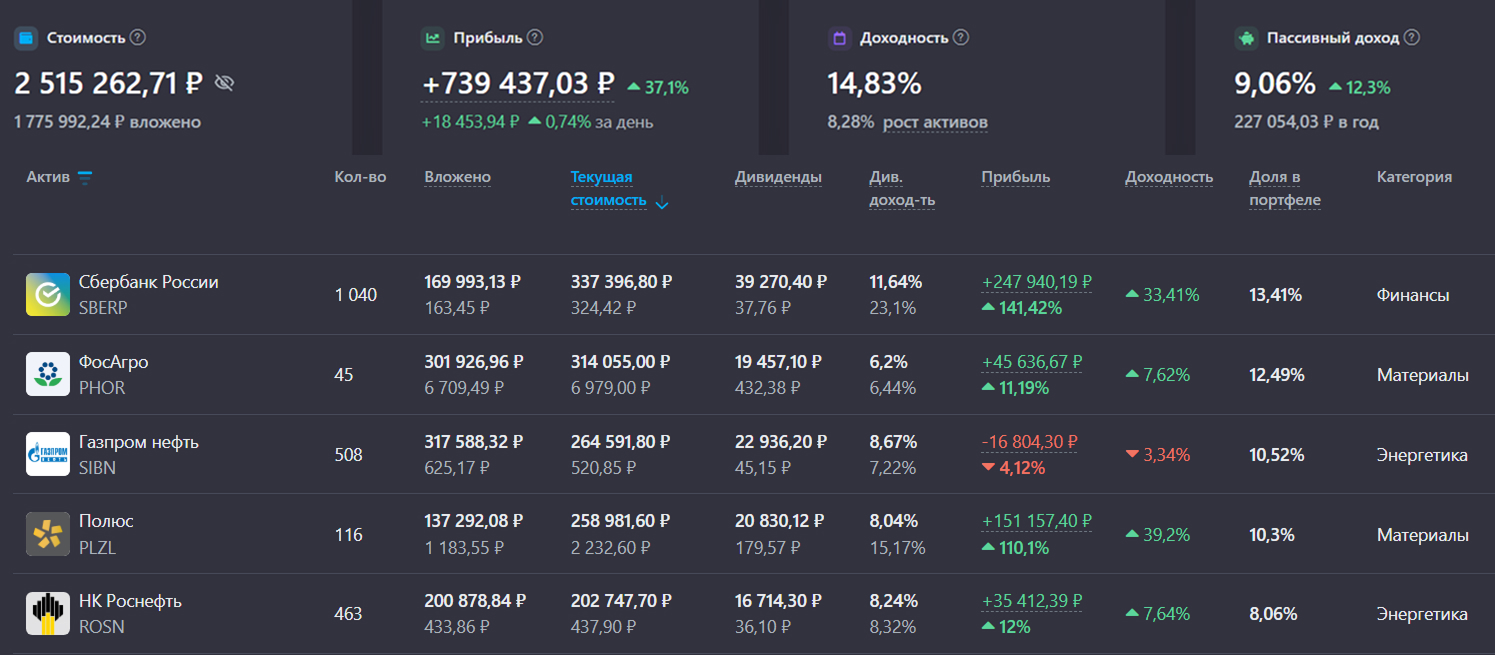 Мой портфель дивидендных акций. Общая сумма ₽2,492 млн