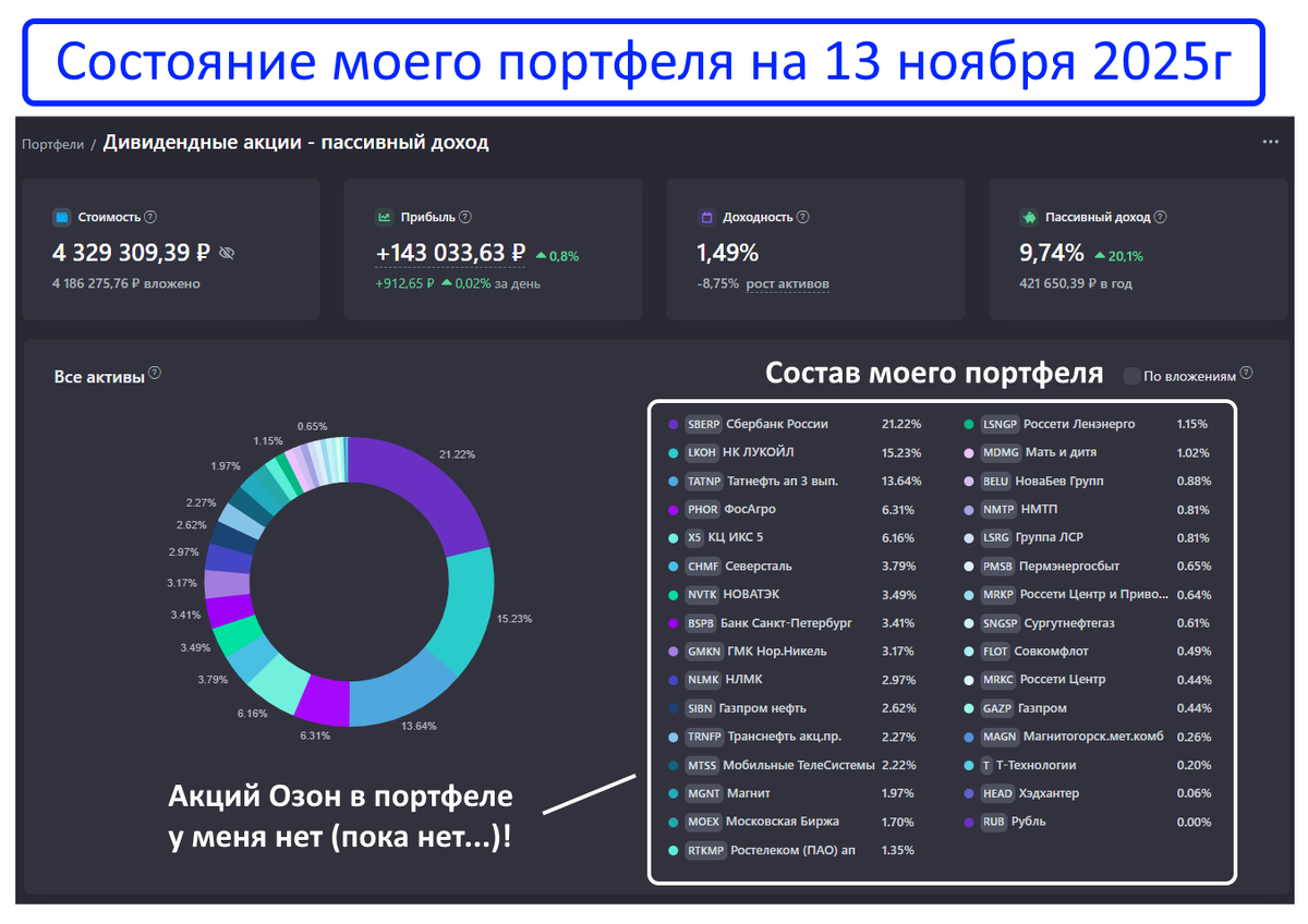 На текущий момент бумаг Озона в моём портфеле нет (скрин состава моего портфеля из сервиса учёта инвестиций, в портфеле теперь не указываю фонд ликвидности, с ним стоимость более 5.7млн р):
