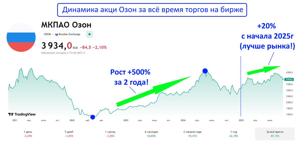 Акции Озон демонстрировали впечатляющий рост еще до решения о переезде в РФ. После обвала на фоне СВО бумаги показали феноменальную динамику, подорожав на +500% за два года. В 2025г тренд сохранился и акция прибавила около +20%, уверенно опережая рынок (индекс Мосбиржи -12% с начала года).
