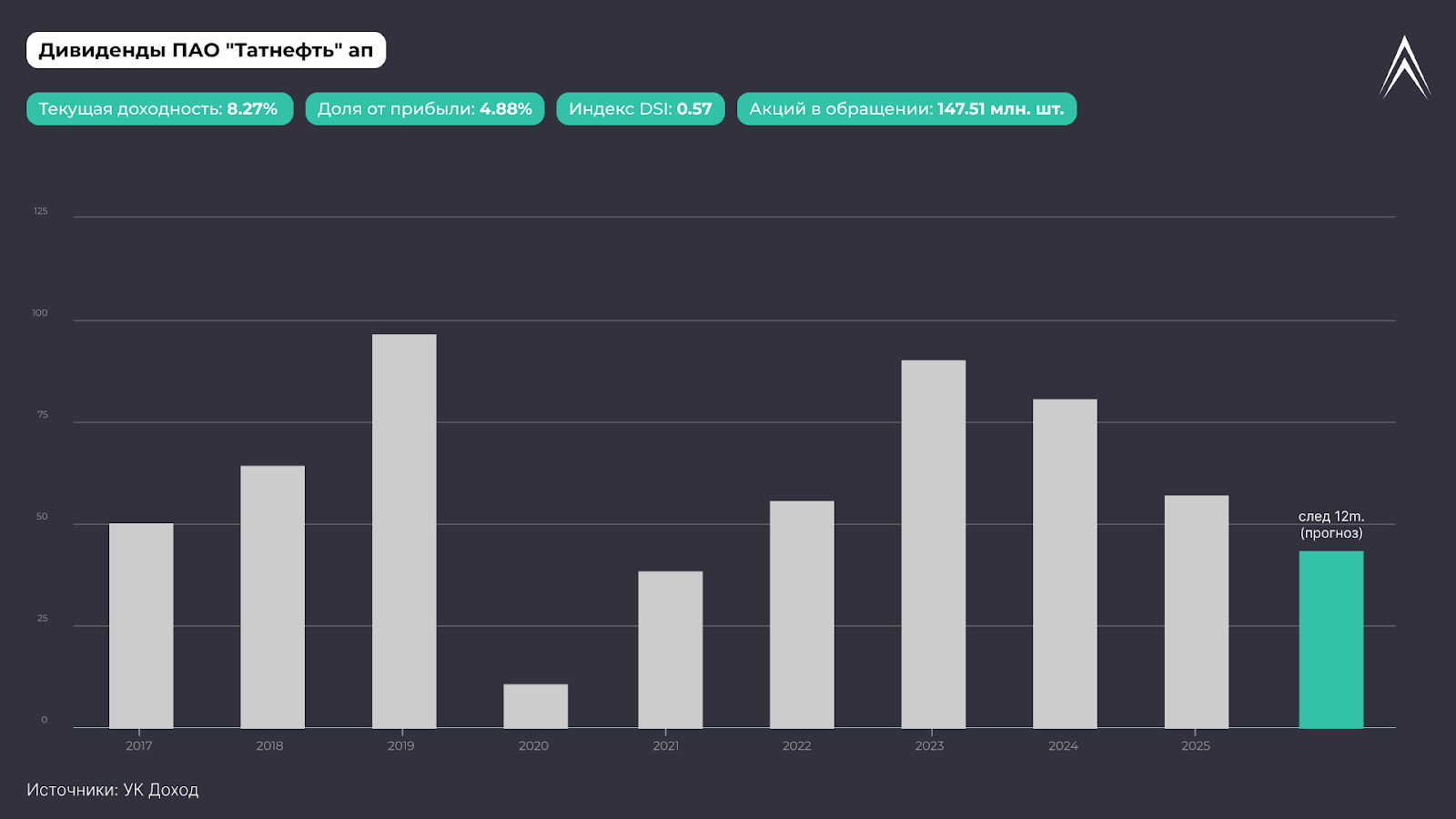 К сожалению, но дивиденды не всегда гарантированы, их могут сократить или вовсе отменить. Сейчас Татнефть занижает выплаты, а в 2020 году и вовсе дивиденды были ниже плинтуса — 10,94 рубля за акцию.