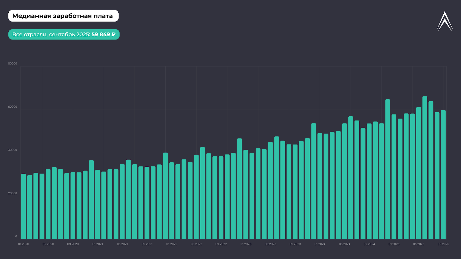 По данным СберИндекса, медианная зарплата составила 59 849 рублей в месяц (на сентябрь 2025).