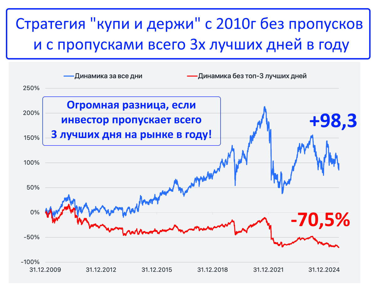 Эти данные показывают, что очень важно быть на рынке в те несколько лучших дней, которые и формируют его основную долгосрочную доходность!