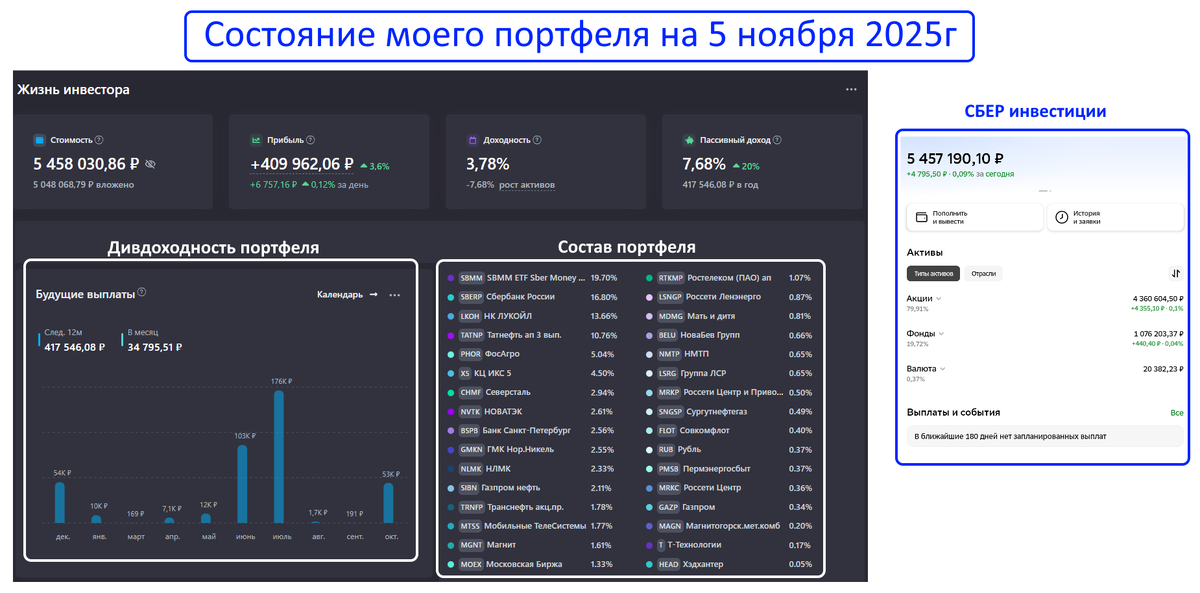Именно поэтому даже сейчас, когда на рынке негатив, я продолжаю держать большую часть капитала в акциях и целенаправленно докупаю их на просадках (скрин с составом моего портфеля из сервиса учёта инвестиций и приложения СБЕР инвестиции):