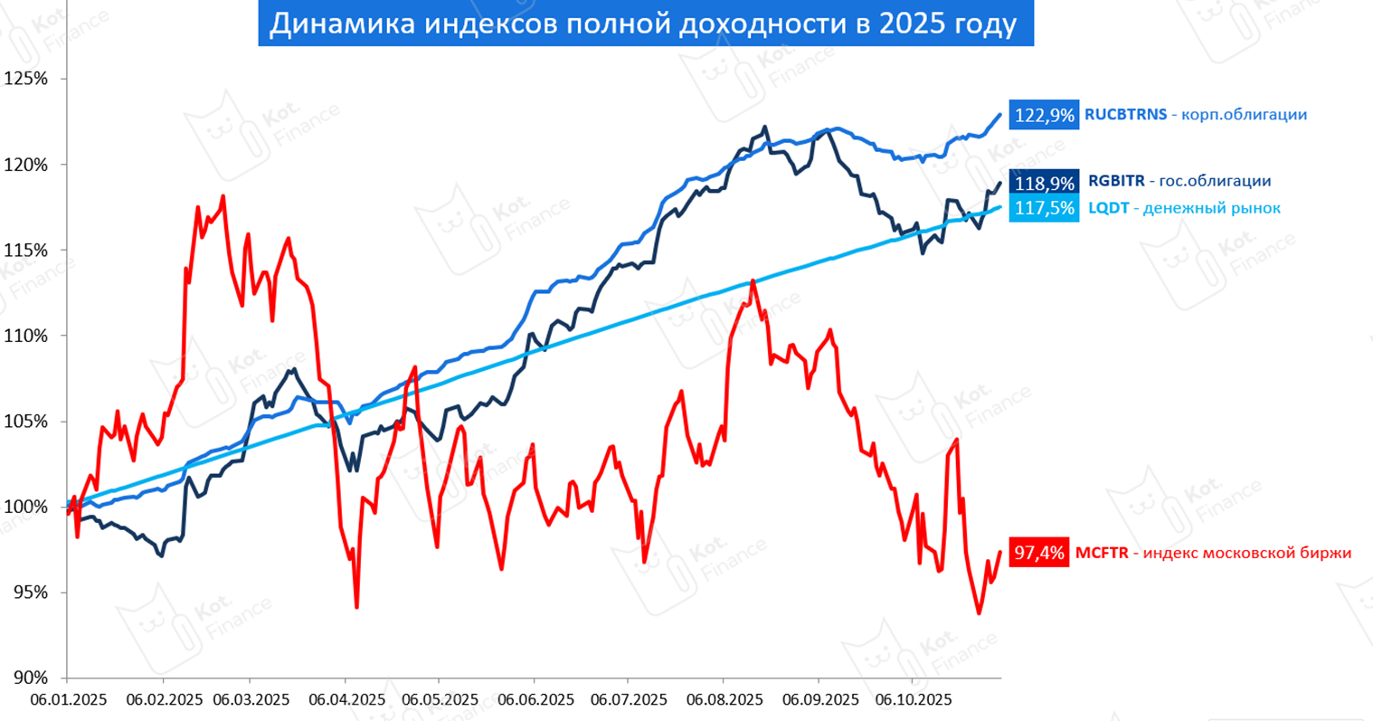 Цыплят по осени считают, а доходность – по году. А мы подводим промежуточные итоги и сравниваем индексы полной доходности в облигациях, индекс Московской биржи с дивидендами и LQDT