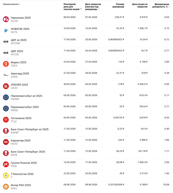 На очереди небольшие мясные дивы от Черкизово и газовые дивы от Новатэка. На май набирается уже потихоньку состав, а Интер открыл июнь.