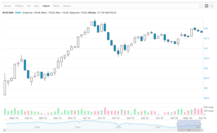 RGBI: 119,3 → 119,0. Ещё немного снизились, но несущественно. Я продолжаю покупать длинные ОФЗ.