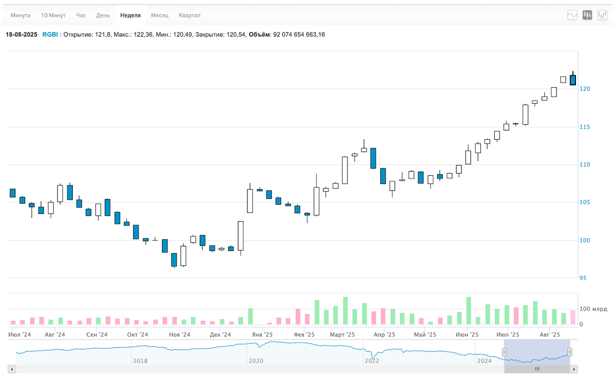 RGBI упал после бурного роста: 121,67 → 120,54. Откат на повышении ожидаемой инфляции населения. Я продолжаю покупать длинные ОФЗ. Апсайд растёт;)