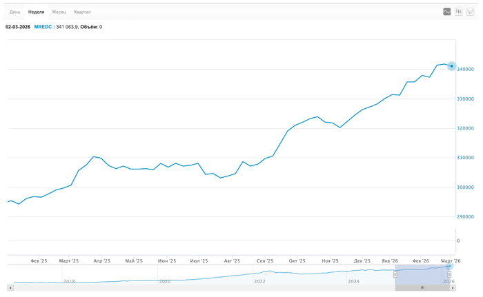 Готовится расти попозже. Индекс MREDC 341,7к → 341,0к за м². Цены остаются вблизи исторических максимумов.