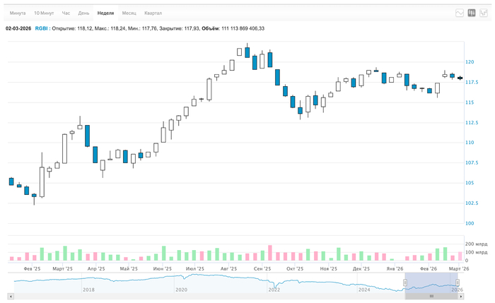RGBI опять вниз: 118,1 → 117,9. Ну и славненько! Я продолжаю покупать длинные ОФЗ.