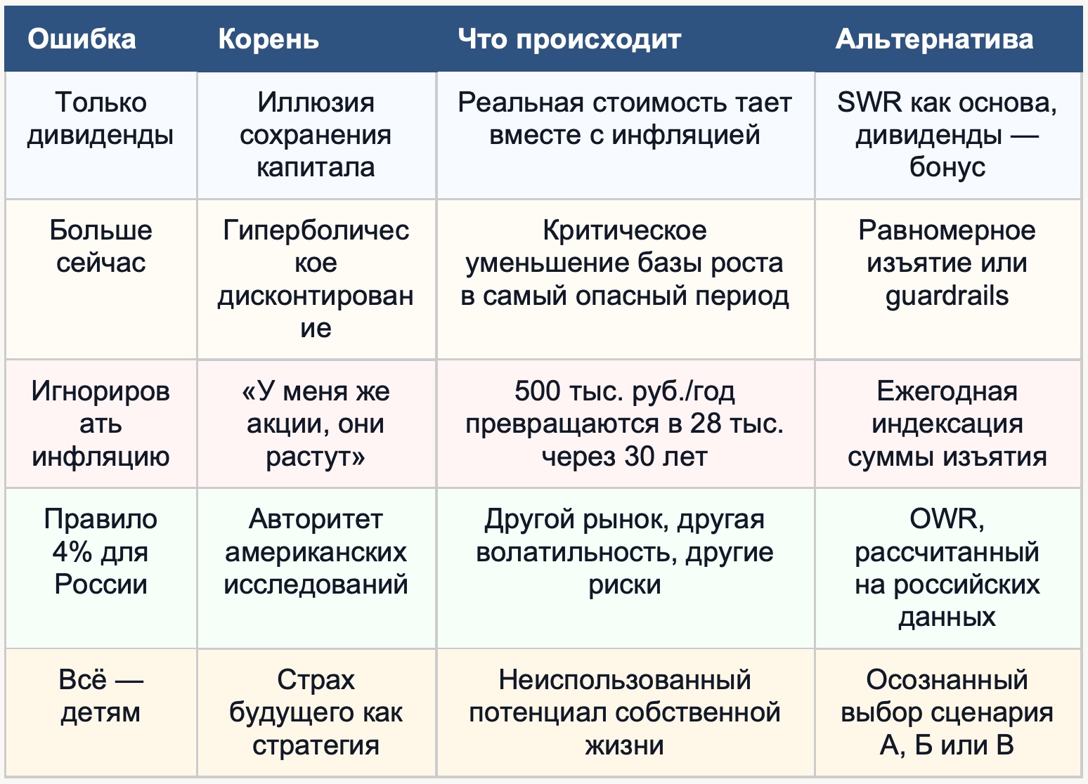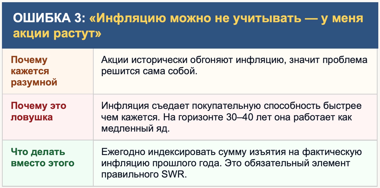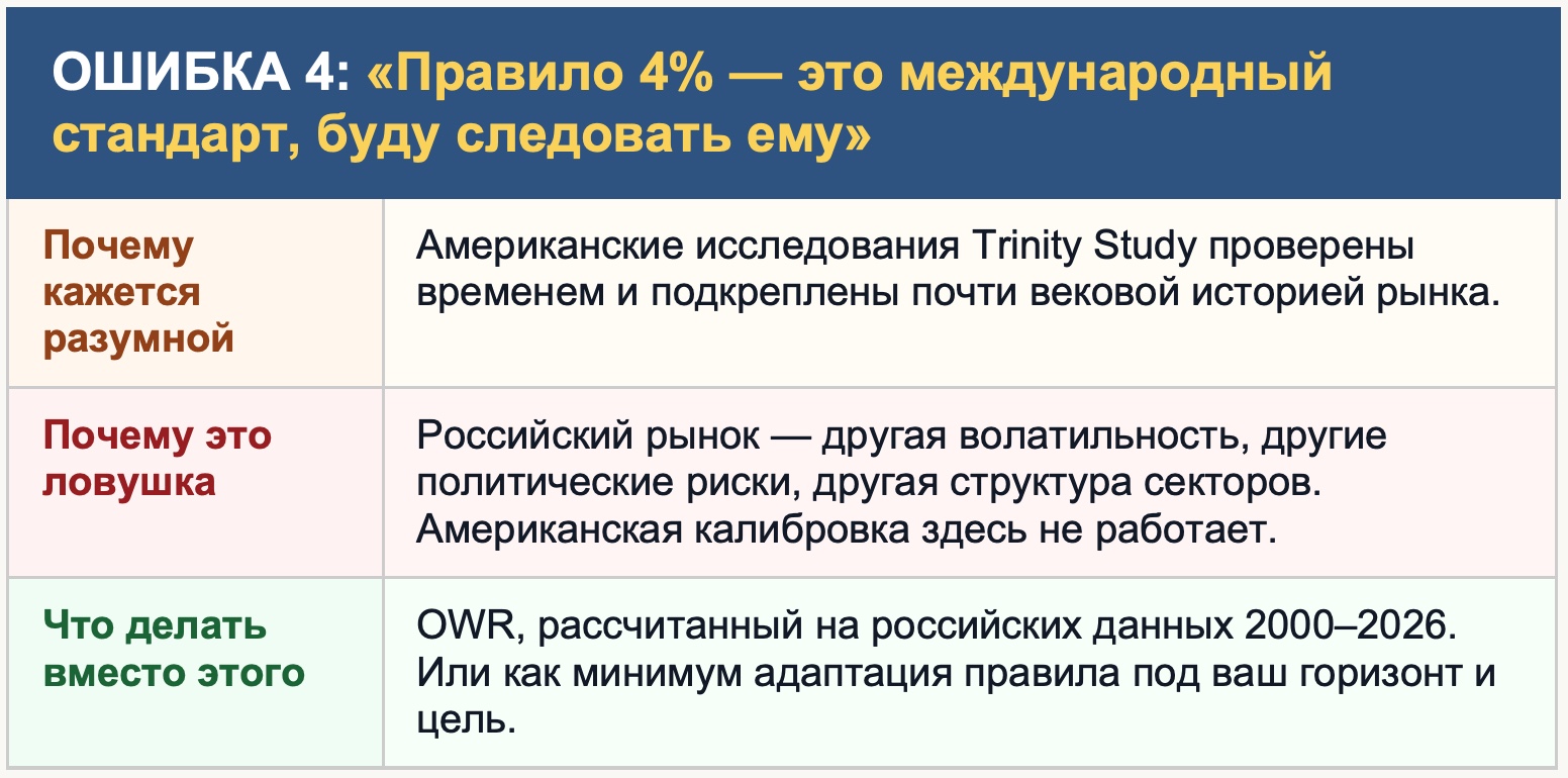 Ещё одна ошибка внутри ошибки: даже если бы правило 4% подходило для России — оно предполагает фиксированный горизонт 30 лет и конкретную терпимость к риску. А если вам 45 лет и горизонт 50 лет? А если вы готовы менять сумму изъятий в зависимости от состояния портфеля? Одно универсальное правило для всех людей, целей и горизонтов — это иллюзия простоты в мире, который устроен сложнее.