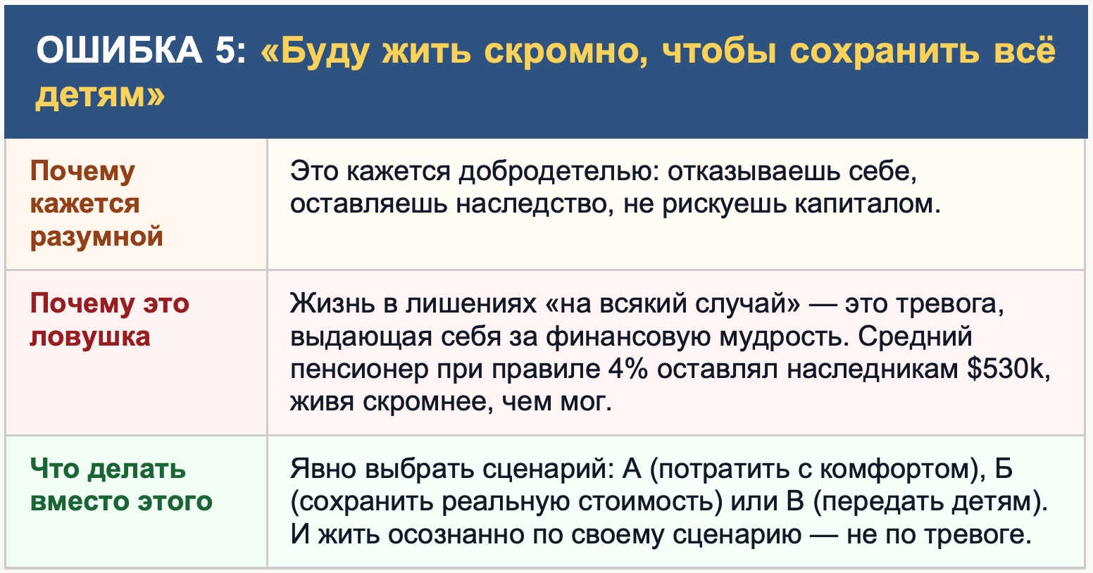 Психологический корень: тревога, выдающая себя за добродетель. Если цель — оставить детям максимум, нужно планировать это явно: выбрать сценарий В из главы 5, рассчитать ставку под этот сценарий и жить по ней осознанно. Не урезать себя из страха, а строить план под конкретную цель.