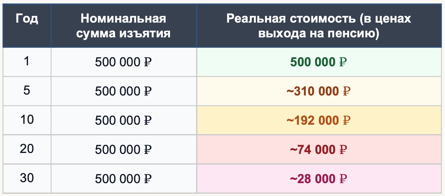 Это самое коварное заблуждение. Инфляция незаметна в краткосрочной перспективе — ну подорожало всё на 9%, ничего страшного. Но на горизонте 30–40 лет она работает как медленный яд.
