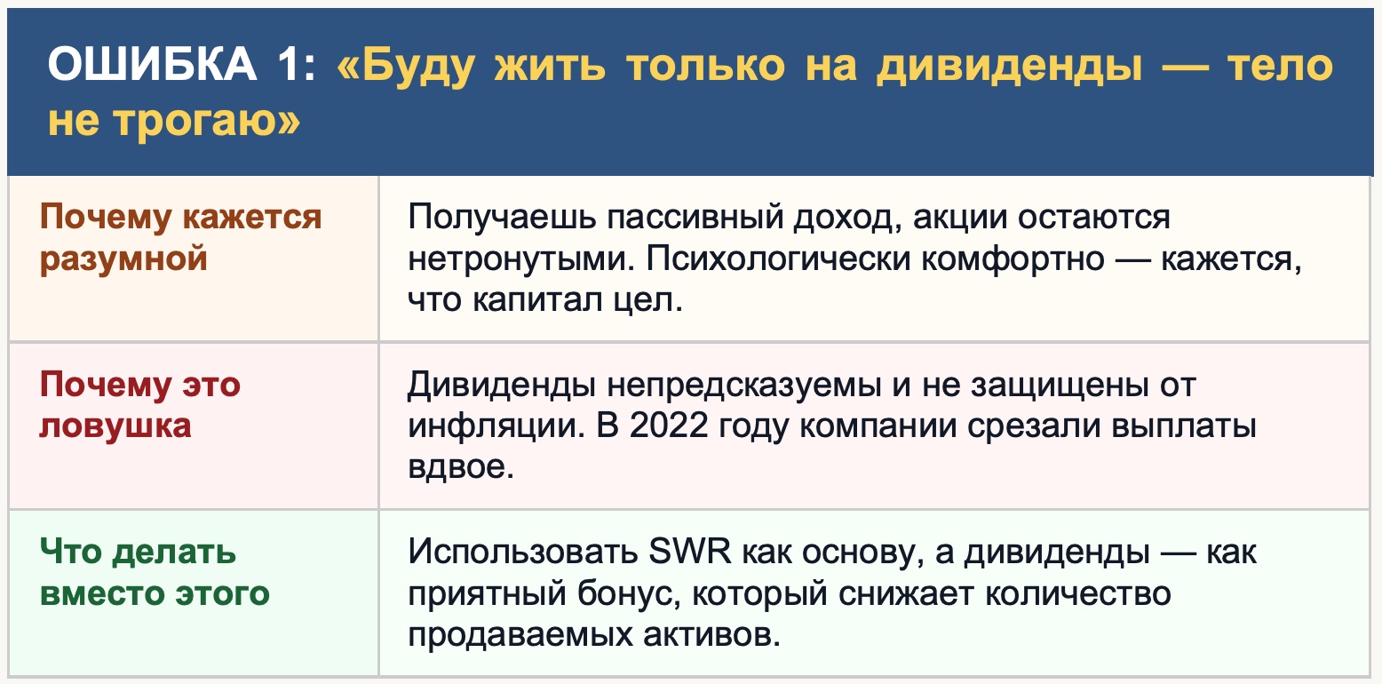 В этой главе я разбираю пять ошибок на крайних примерах. Человек, который живёт только на дивиденды и не трогает тело. Человек, который тратит всё в первые годы пенсии. Человек, который отказывает себе во всём ради детей.