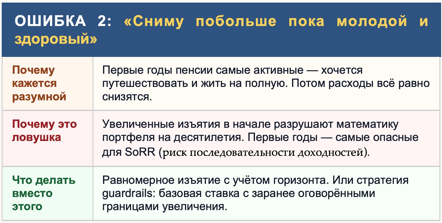 Почему это так опасно именно в начале? Мы разбирали это в главе 4: риск последовательности доходностей (SoRR) максимален именно в первые годы пенсии. Если рынок упадёт — а вы при этом забираете больше нормы — вы продаёте акции по низким ценам и уменьшаете базу восстановления. Потом рынок вырастет, но этих проданных акций уже не будет.