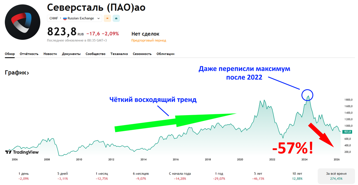 Северсталь $CHMF — это по-прежнему один из лучших сталеваров в мире, но сейчас их финансы рухнули до многолетних минимумов, дивиденды, которыми они привлекали инвесторов, исчезли, а график котировок смотрит вниз.