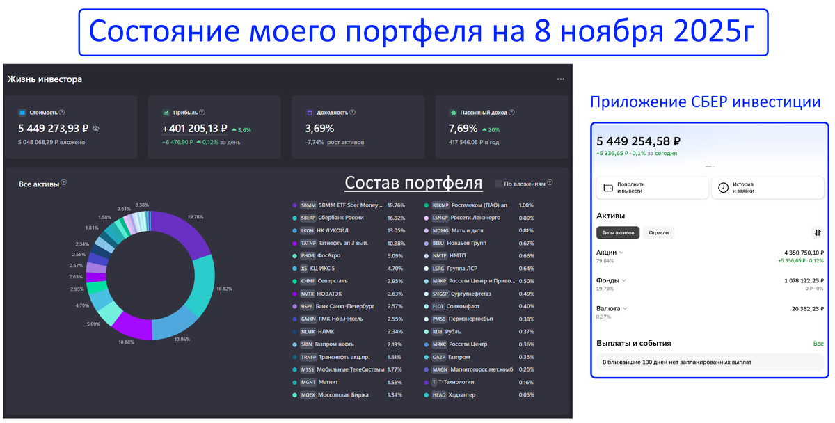 Например, сейчас я стараюсь инвестировать в акции по 70-100тр в месяц (скрин моего портфеля из сервиса учёта инвестиций и приложения СБЕР инвестор):