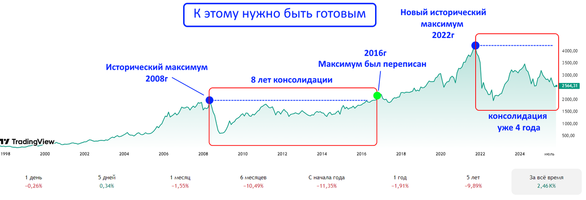 В чем опасность? Вы можете купить на пике, а потом годами наблюдать за боковым движением. Но в этом же кроется и возможность, если у вас долгий горизонт инвестирования!