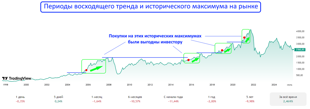 Если проанализировать динамику рынка, мы увидим, что покупка на исторических максимумах с точки зрения последующей доходности почти не отличается от покупки в любой случайный день. Более того, такие покупки часто бывают выгодны: